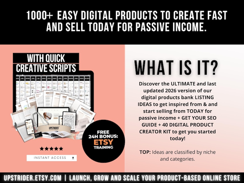 It is an interactive course-hosted resource that contains 1000+ Digital Product Ideas for your small business, classified by different niches and outcomes. You will find an example of each digital product idea, SEO keywords to use to rank for, and in-depth step-by-step scripts to use, to help you get started with the creation of the product! You can keep coming back to it, it’s super easy to use and intuitive! FREE BONUS: Discover your new Digital Product Creator Kit of 40 sheets to help you get started and an entire SEO breakdown to explain to you how to structure your title, tags and Etsy shop as a whole! You can literally create and start selling today!
